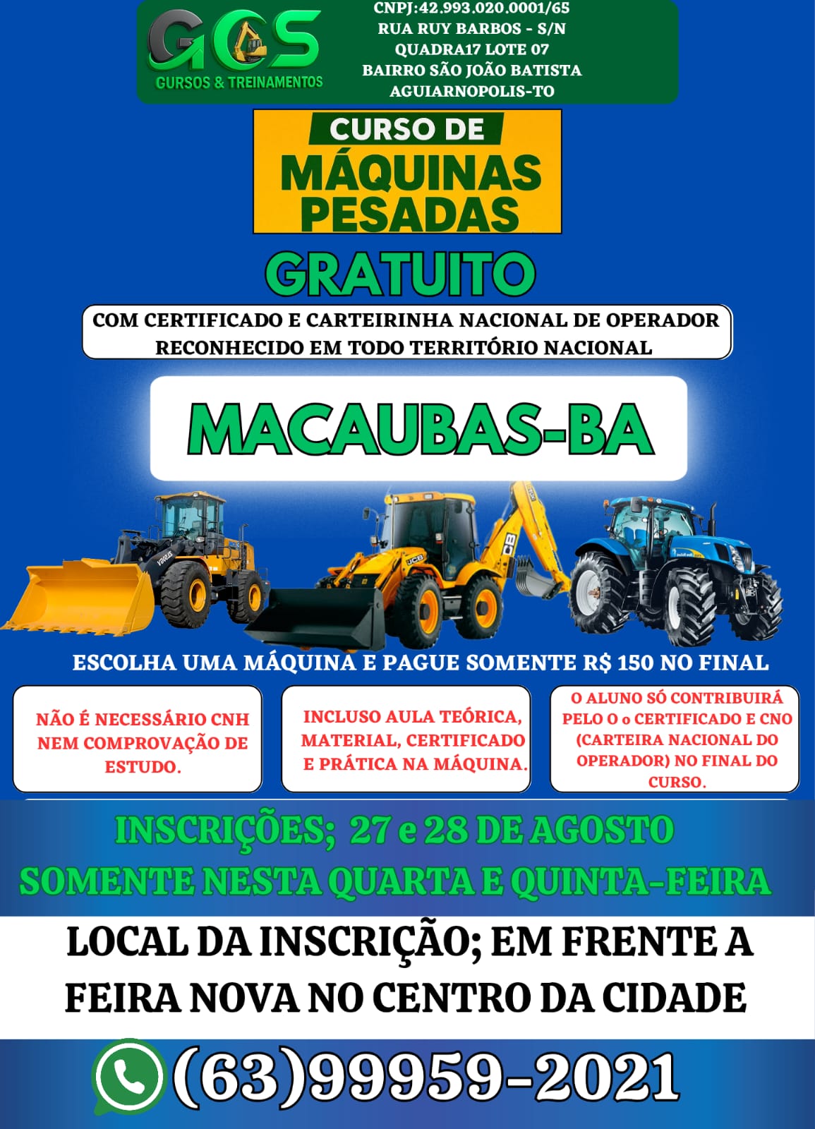 GCS CURSOS E TREINAMENTOS ESTA EM MACAÚBAS PARA MINISTRAR O CURSO DE MAQUINAS PESADAS.