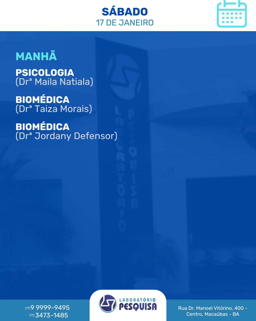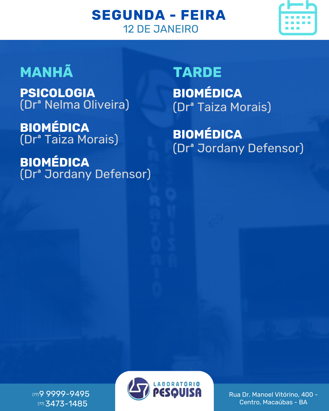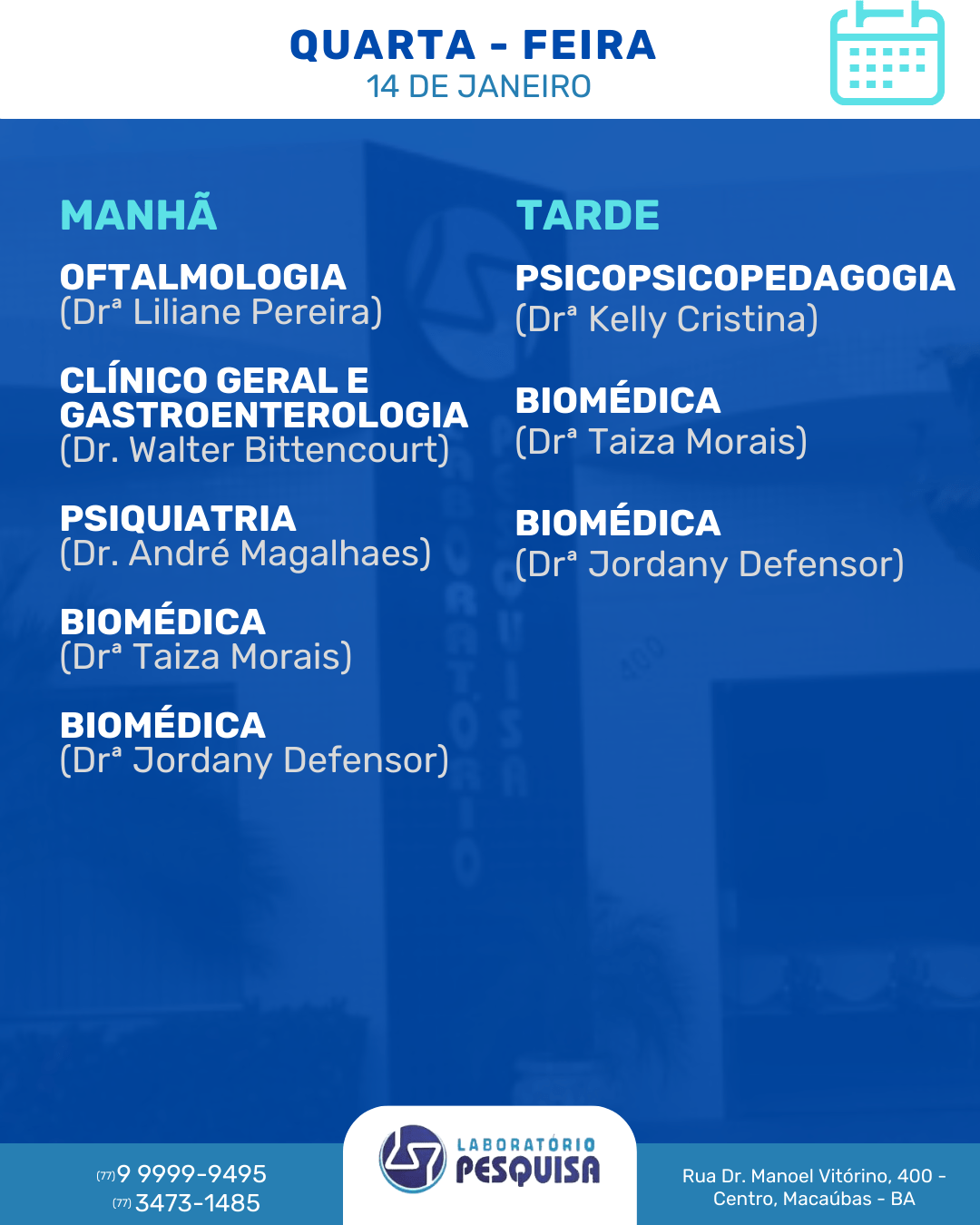 O Laboratório Pesquisa está localizado na Rua Dr. Manoel Vitorino, 400 no Centro de Macaúbas – BA. Veja abaixo a agenda semanal de atendimento para o mês de Janeiro de 2026 e marque a sua consulta. São vários profissionais em diversas especialidades. Fone: (77) 3473-1485 / (77) 99999-9495.