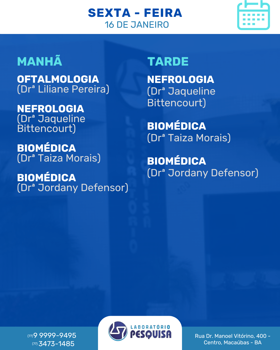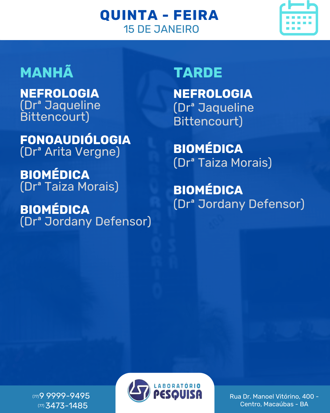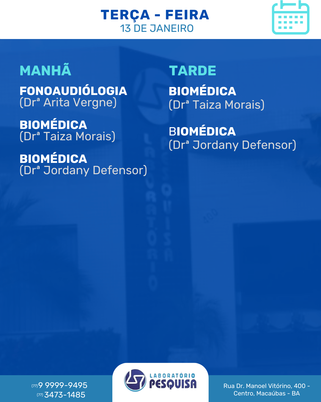 O Laboratório Pesquisa está localizado na Rua Dr. Manoel Vitorino, 400 no Centro de Macaúbas – BA. Veja abaixo a agenda semanal de atendimento para o mês de Janeiro de 2026 e marque a sua consulta. São vários profissionais em diversas especialidades. Fone: (77) 3473-1485 / (77) 99999-9495.