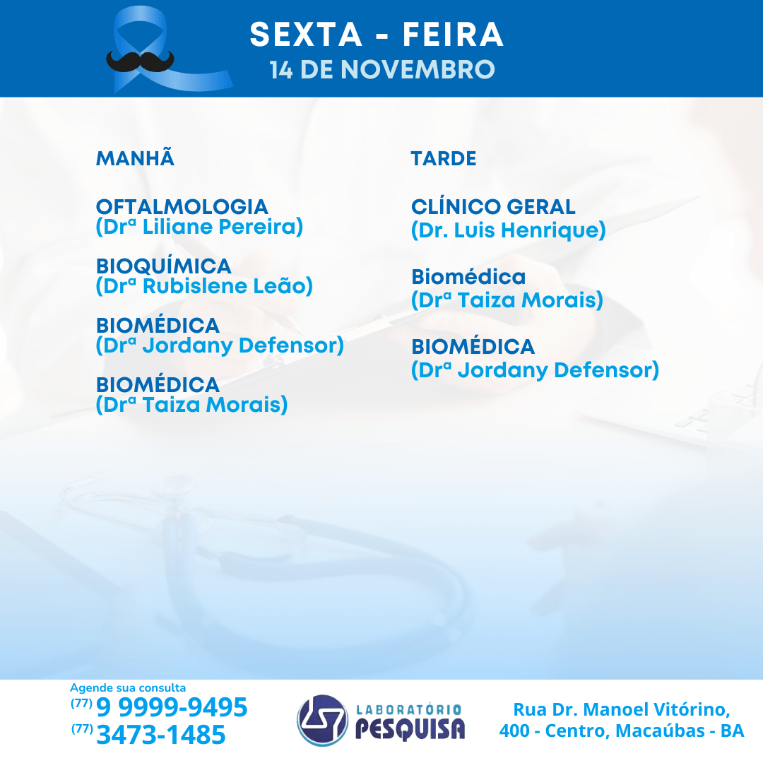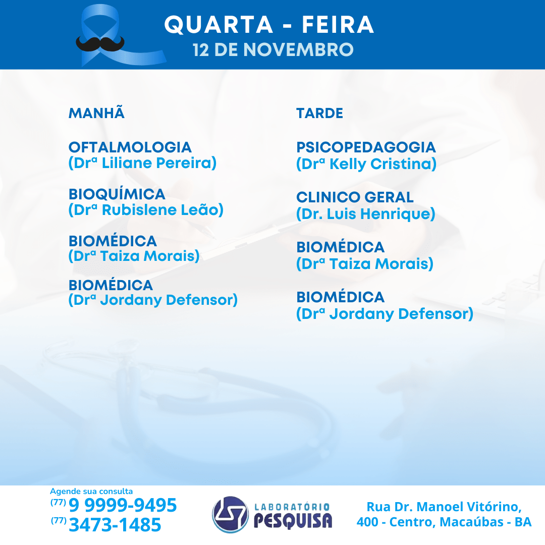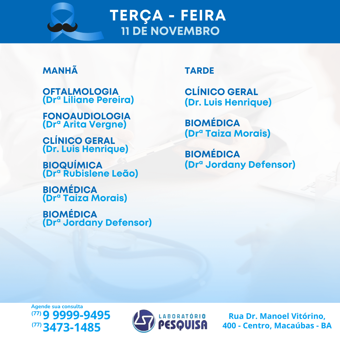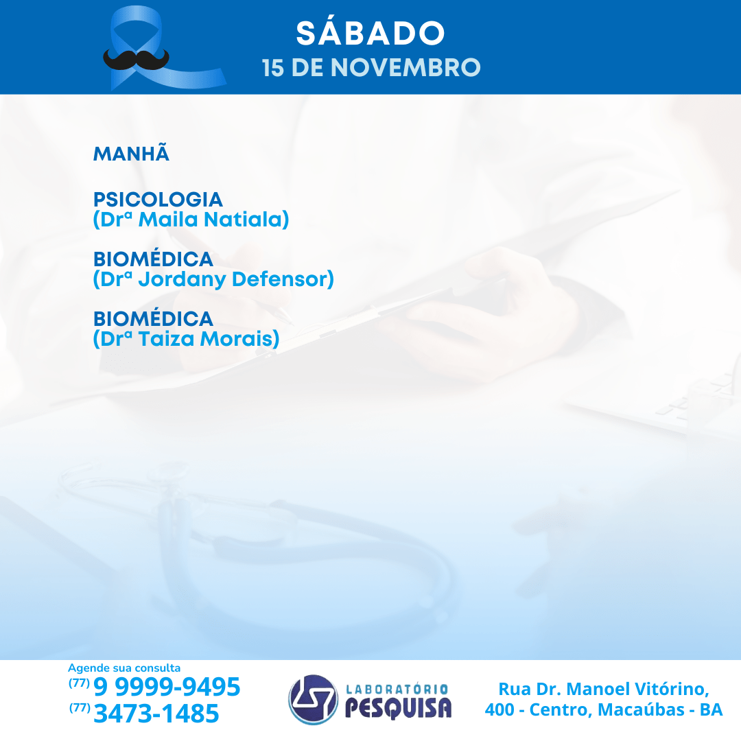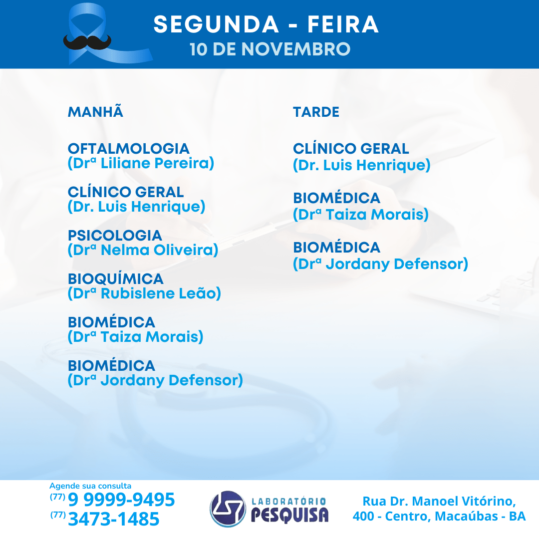 O Laboratório Pesquisa está localizado na Rua Dr. Manoel Vitorino, 400 no Centro de Macaúbas – BA. Veja abaixo a agenda semanal de atendimento para o mês de novembro de 2024 e marque a sua consulta. São vários profissionais em diversas especialidades. Fone: (77) 3473-1485 / (77) 99999-9495.