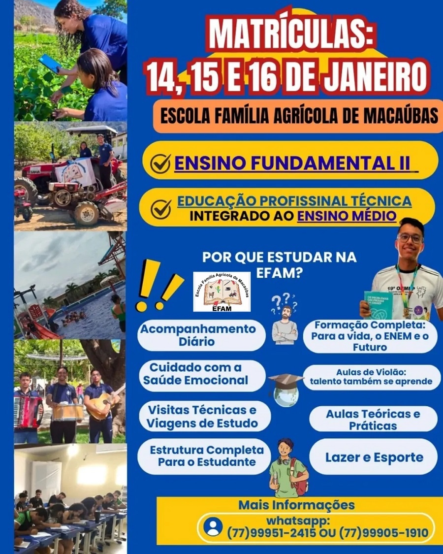Se você busca uma educação que vai além da sala de aula tradicional, unindo o aprendizado técnico à formação humana, a Escola Família Agrícola de Macaubas (EFAM) é o lugar certo.
