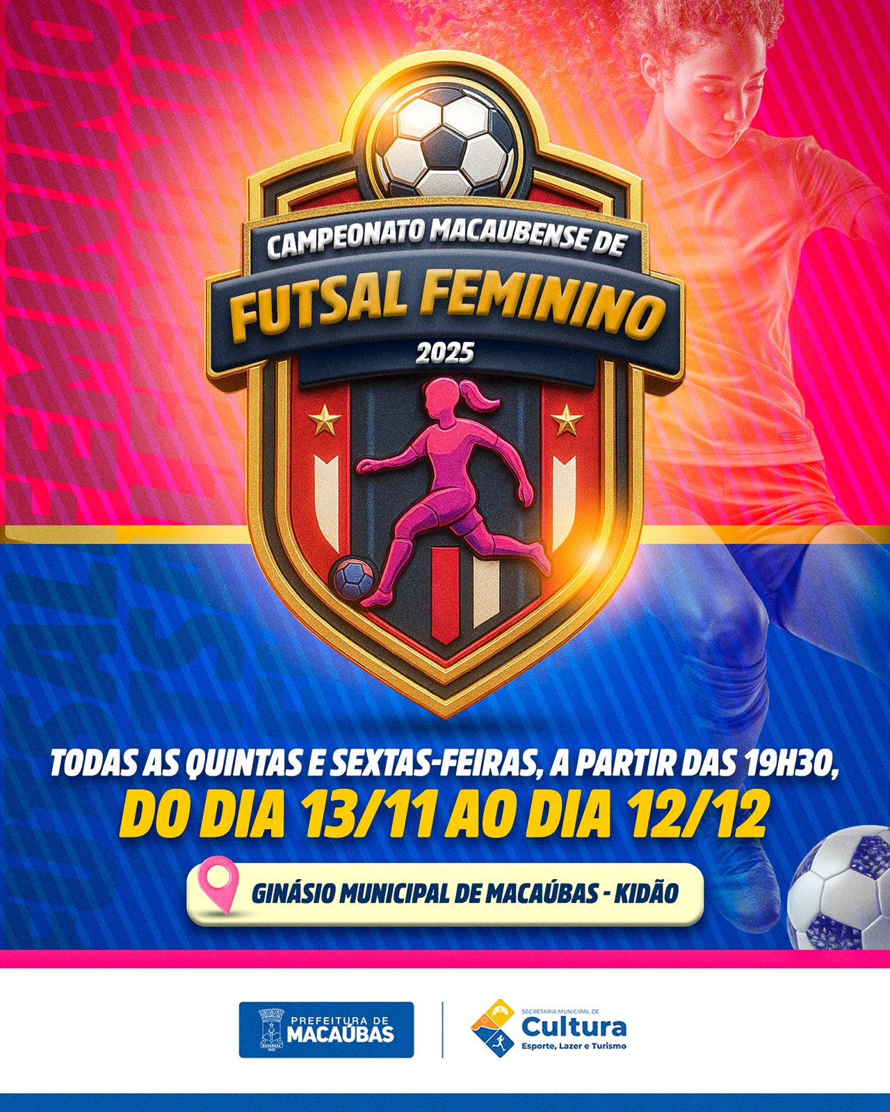 O Campeonato Macaubense de Futsal Feminino vai começar nesta quinta-feira, 13 de novembro, às disputas vão serem realizadas no Ginásio Municipal de Macaúbas! Prepare-se para torcer, vibrar e apoiar nossas atletas que vão dar um show em quadra!