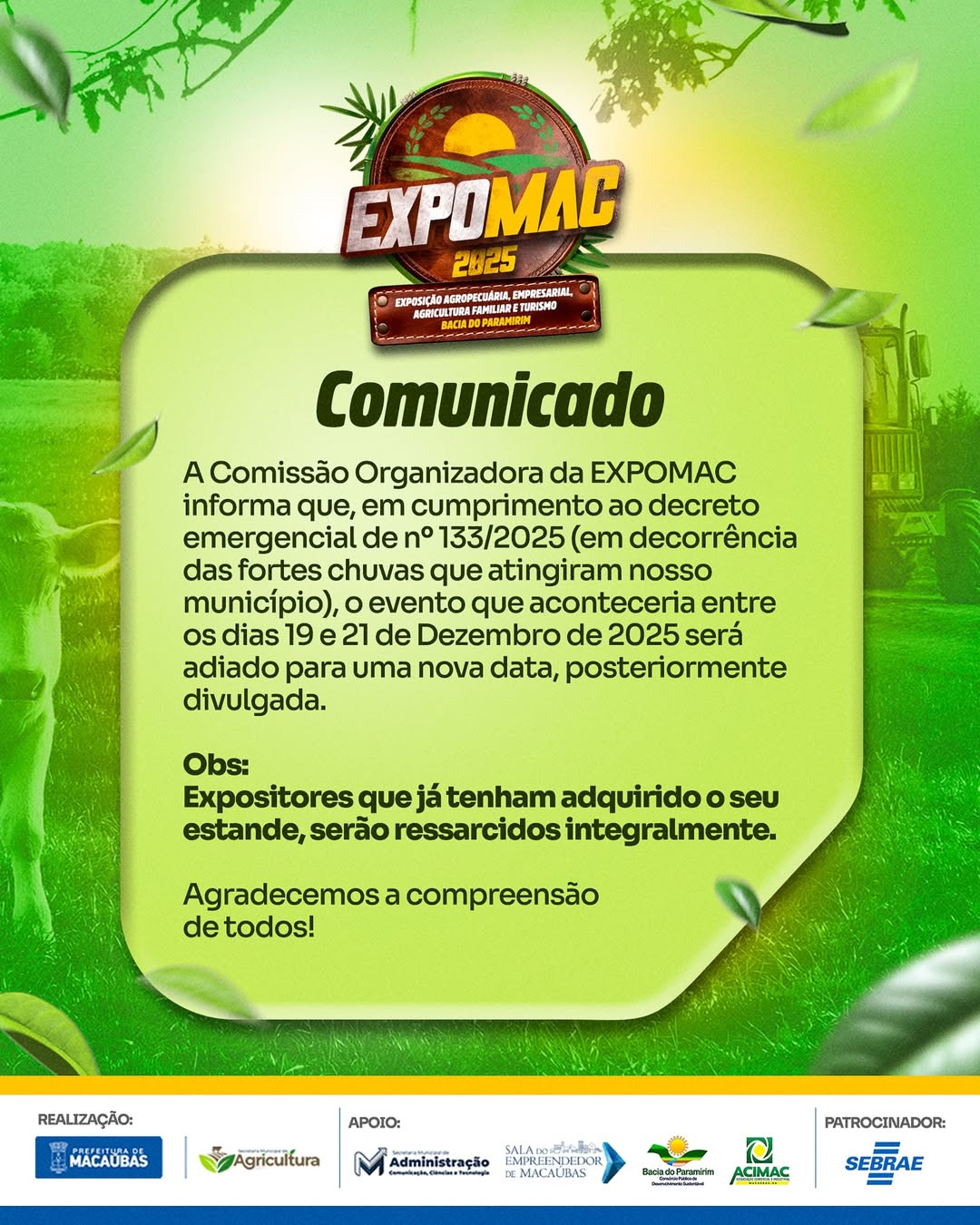 A Comissão Organizadora da EXPOMAC informa que, em cumprimento ao decreto emergencial de n° 133/2025 (em decorrência das fortes chuvas que atingiram nosso município), o evento que aconteceria entre os dias 19 e 21 de Dezembro de 2025 será adiado para uma nova data, posteriormente divulgada.