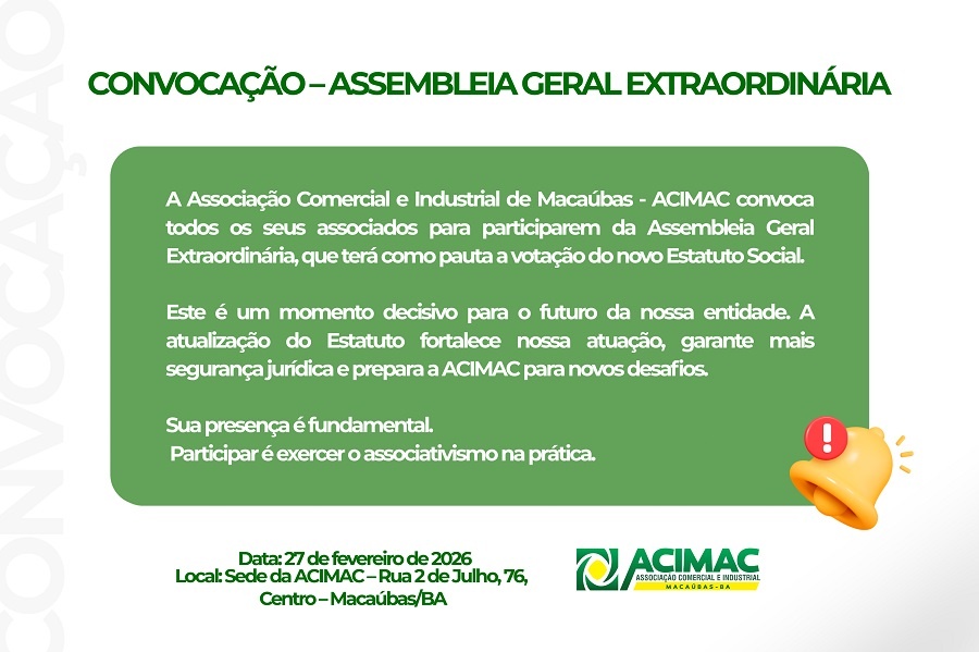 A Associação Comercial e Industrial de Macaúbas – ACIMAC convoca todos os seus associados aptos a votar para participarem da Assembleia Geral Extraordinária, que terá como pauta a votação do novo Estatuto Social da entidade.