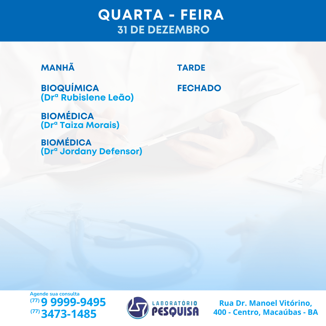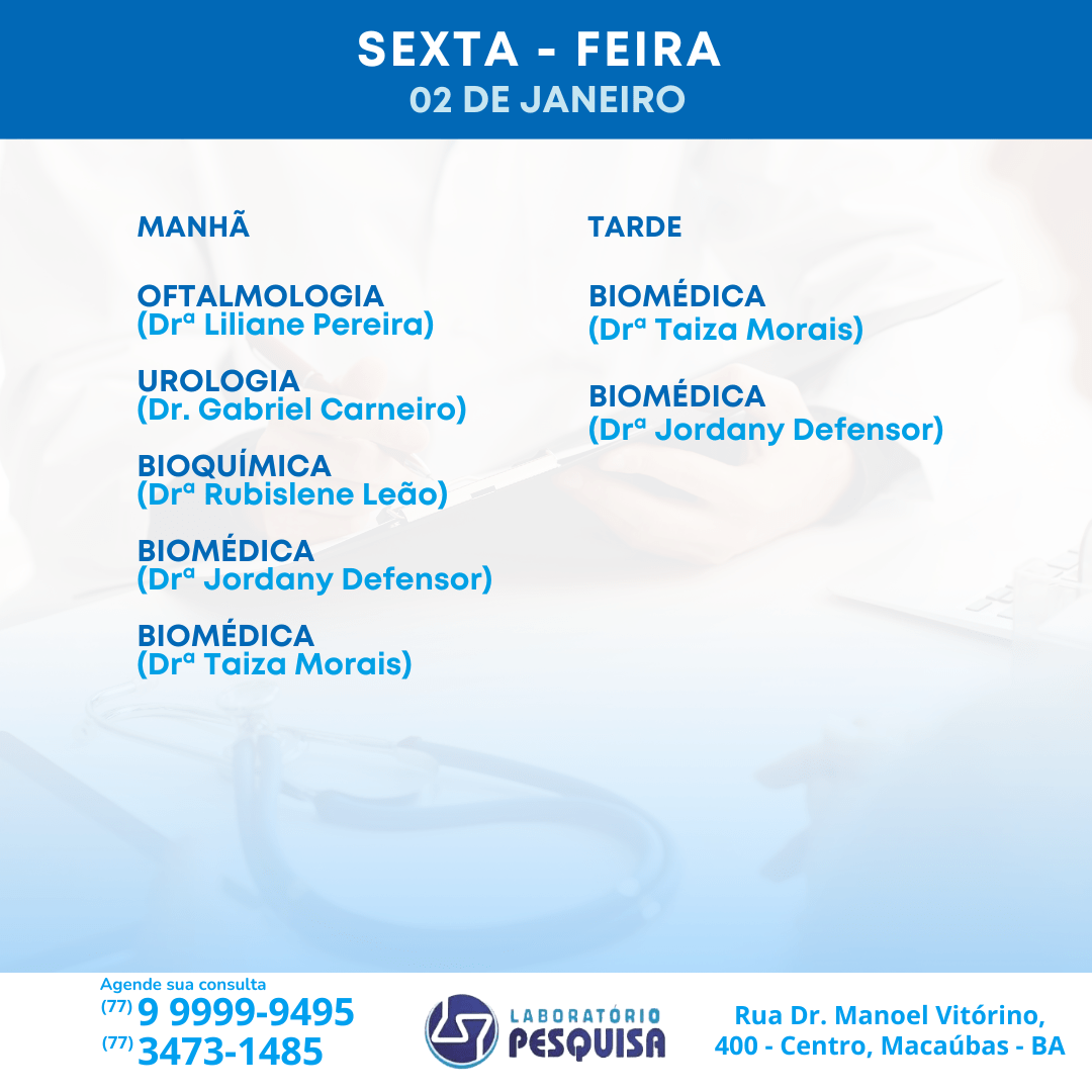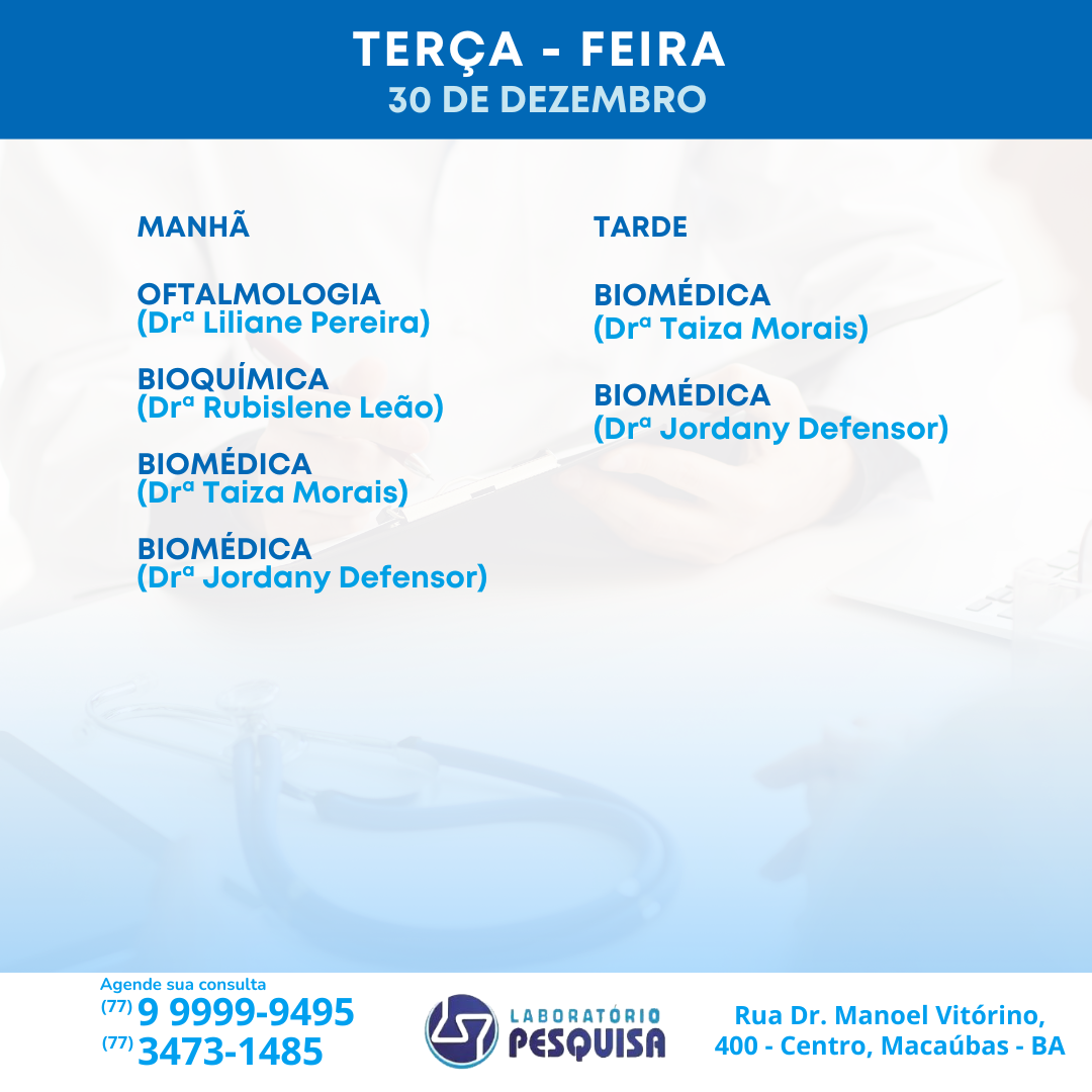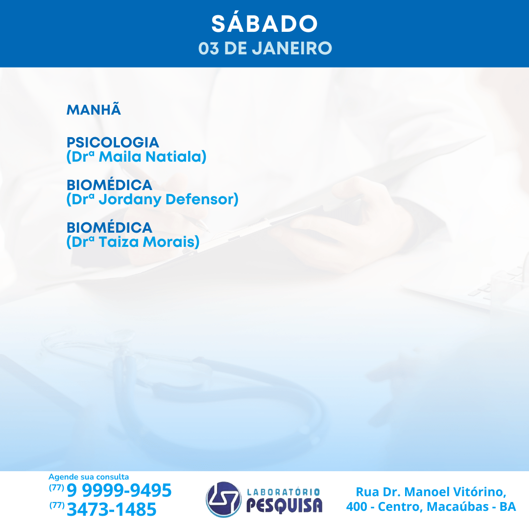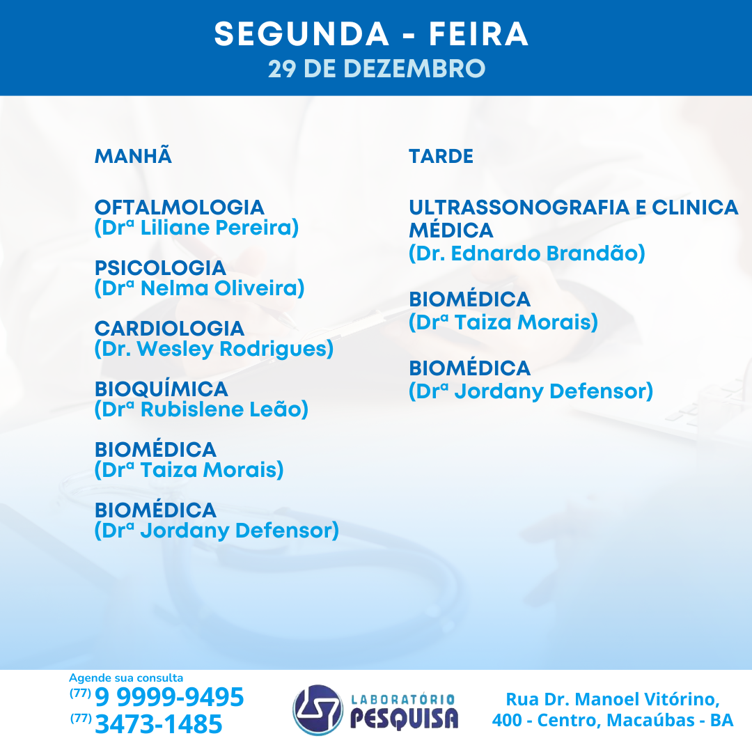 O Laboratório Pesquisa está localizado na Rua Dr. Manoel Vitorino, 400 no Centro de Macaúbas – BA. Veja abaixo a agenda semanal de atendimento para o mês de dezembro de 2024 e marque a sua consulta. São vários profissionais em diversas especialidades. Fone: (77) 3473-1485 / (77) 99999-9495.
