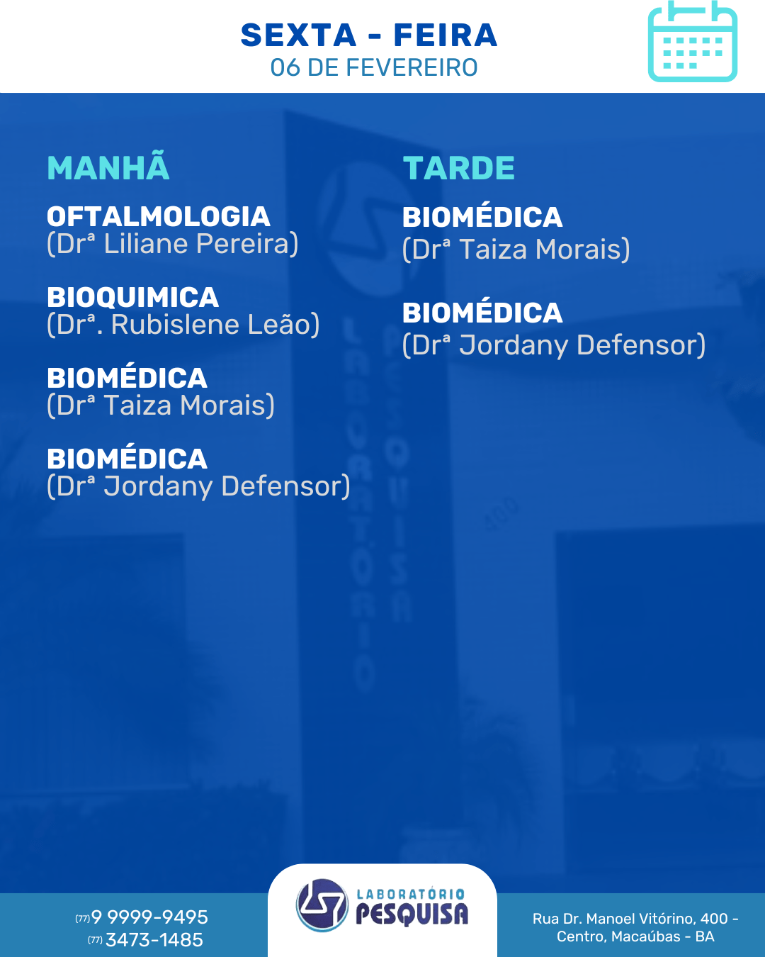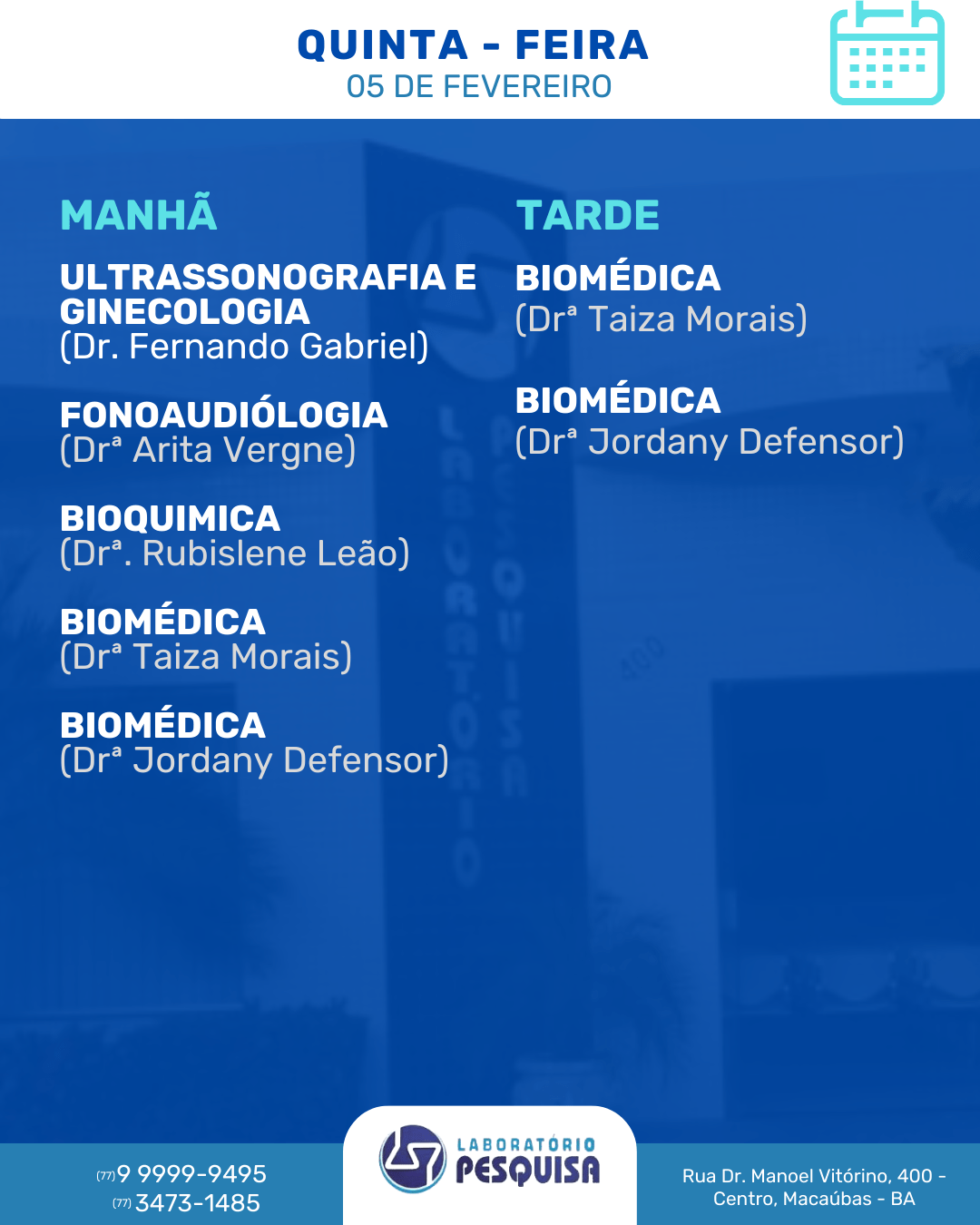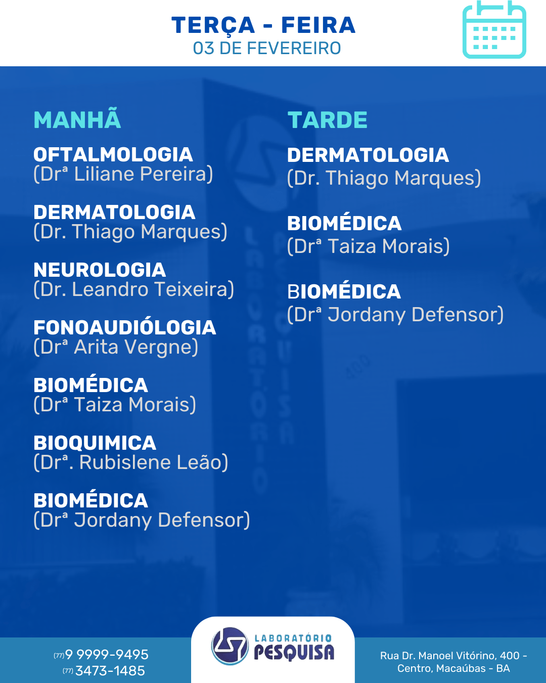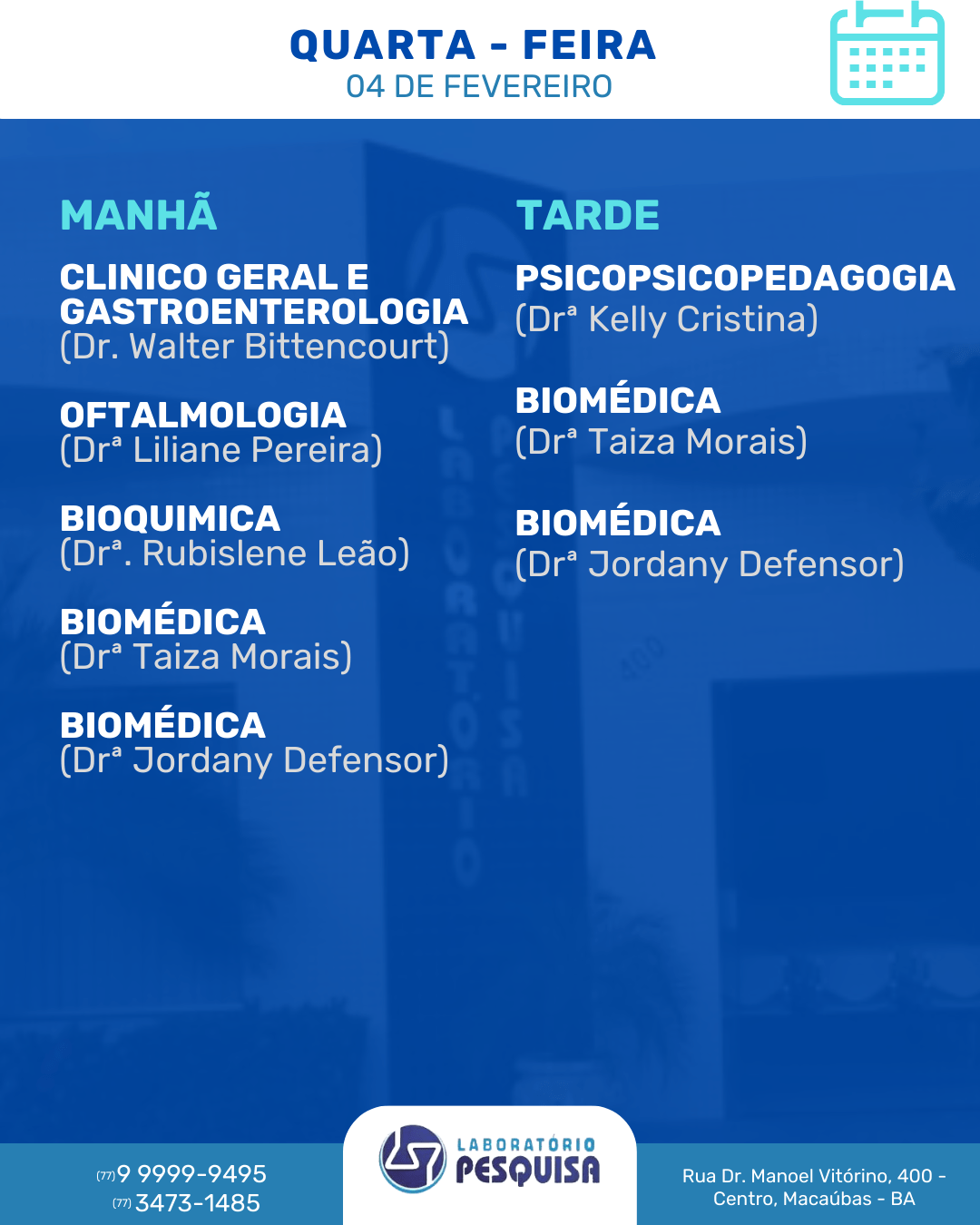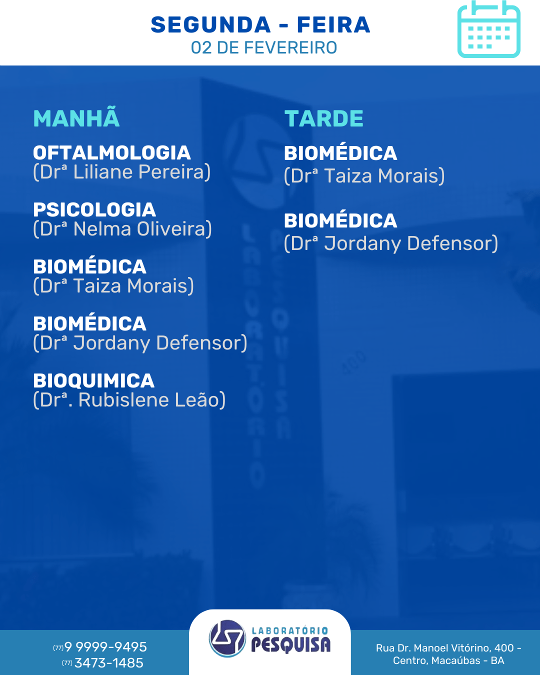 O Laboratório Pesquisa está localizado na Rua Dr. Manoel Vitorino, 400 no Centro de Macaúbas – BA. Veja abaixo a agenda semanal de atendimento para o mês de fevereiro de 2026 e marque a sua consulta. São vários profissionais em diversas especialidades. Fone: (77) 3473-1485 / (77) 99999-9495.
