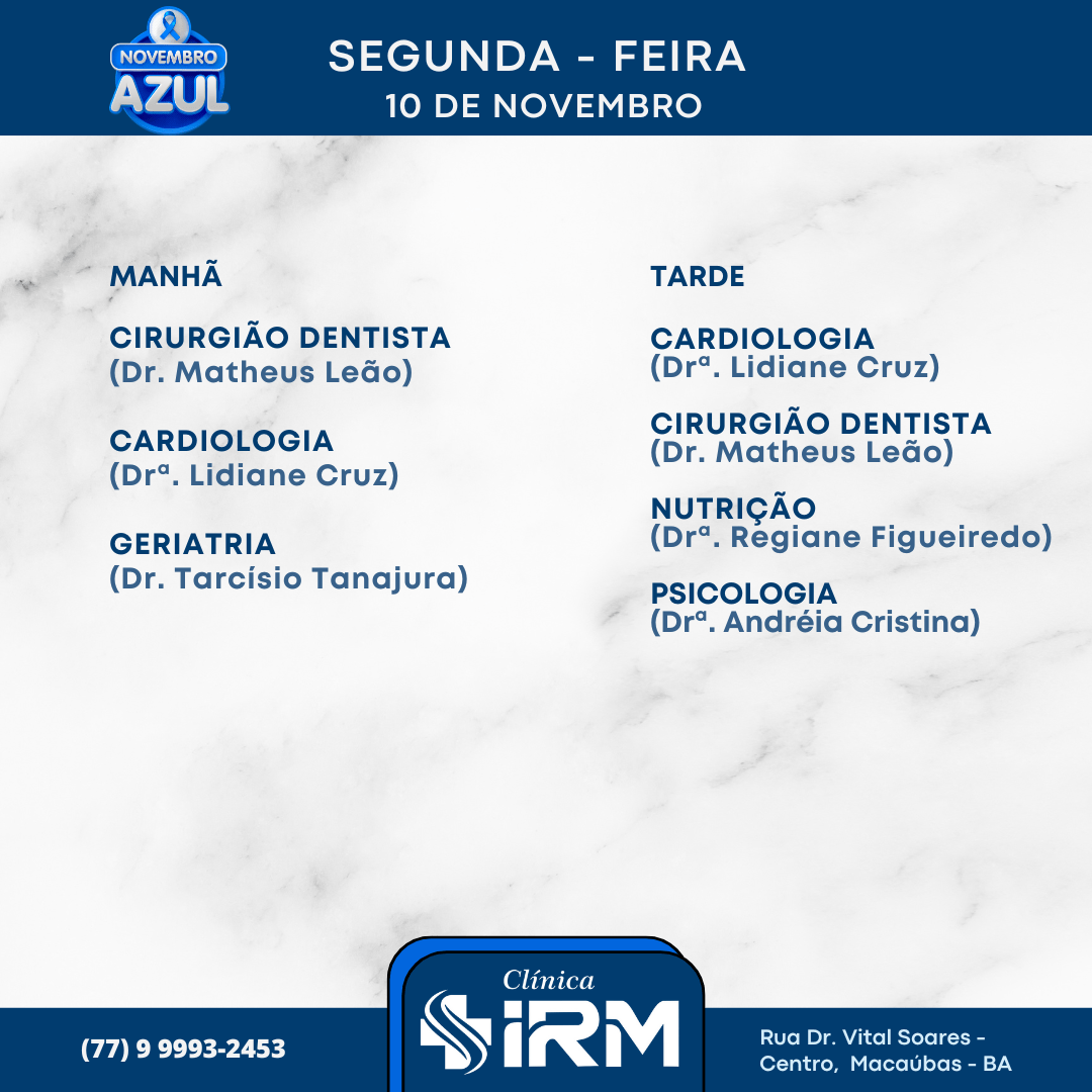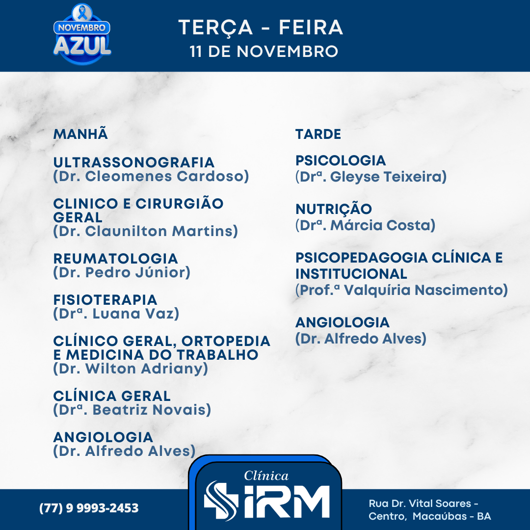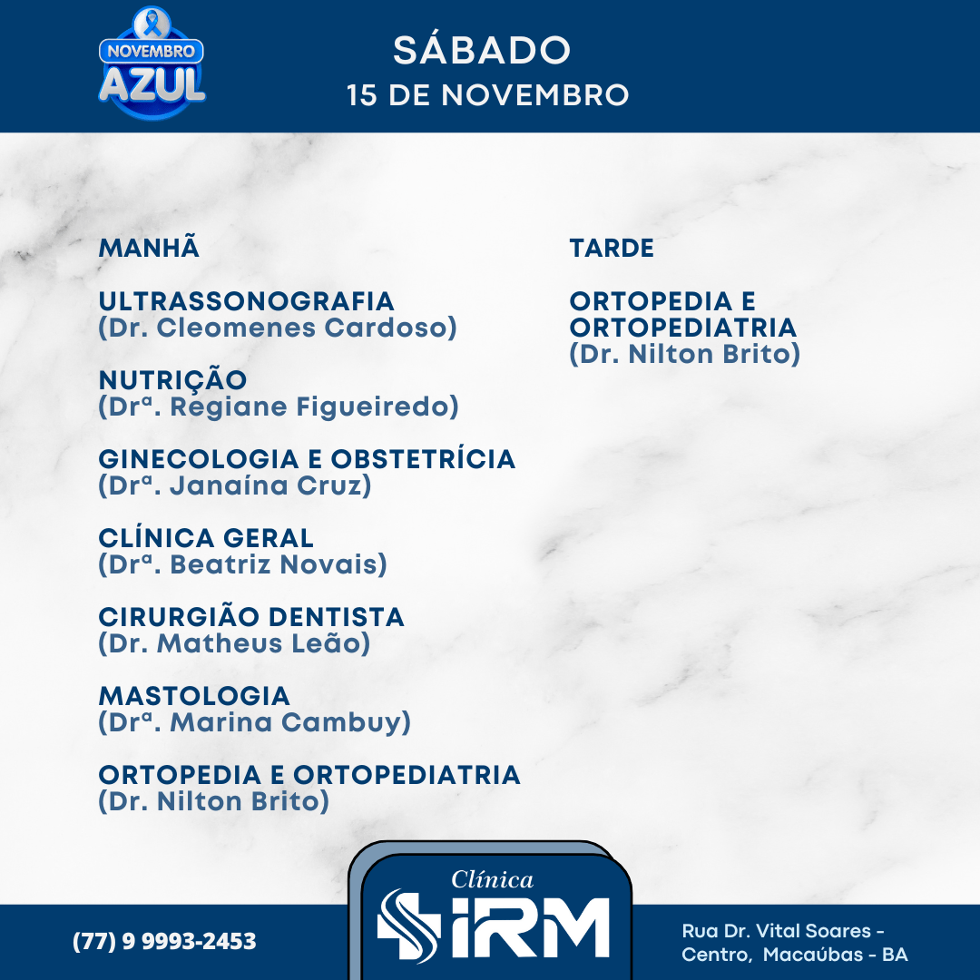 AGENDA SEMANAL DE ATENDIMENTO – MÊS DE NOVEMBRO NA CLÍNICA IRM – MACAÚBAS
