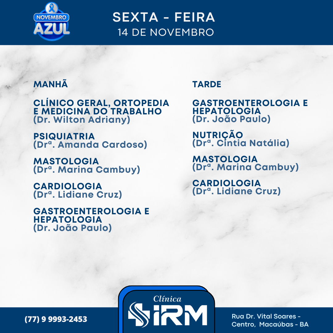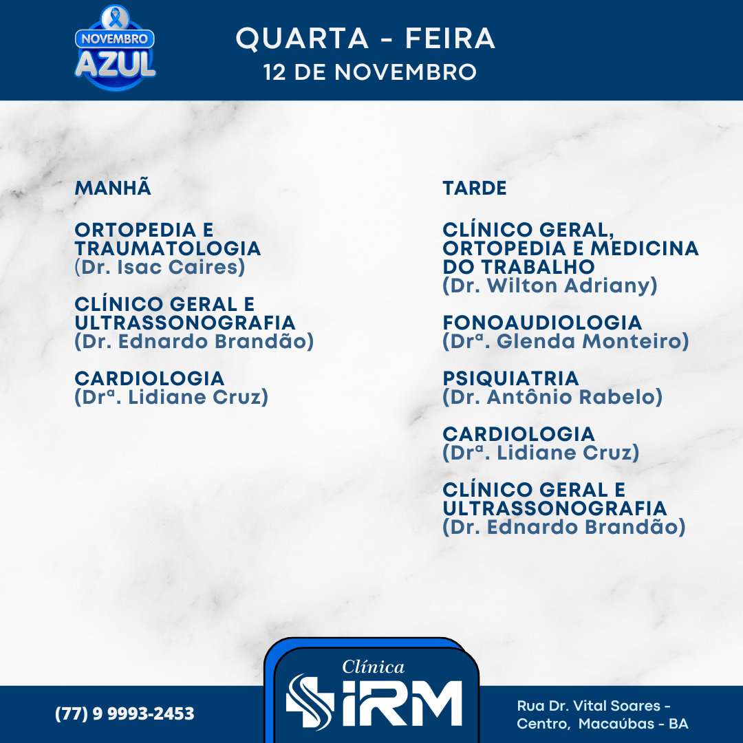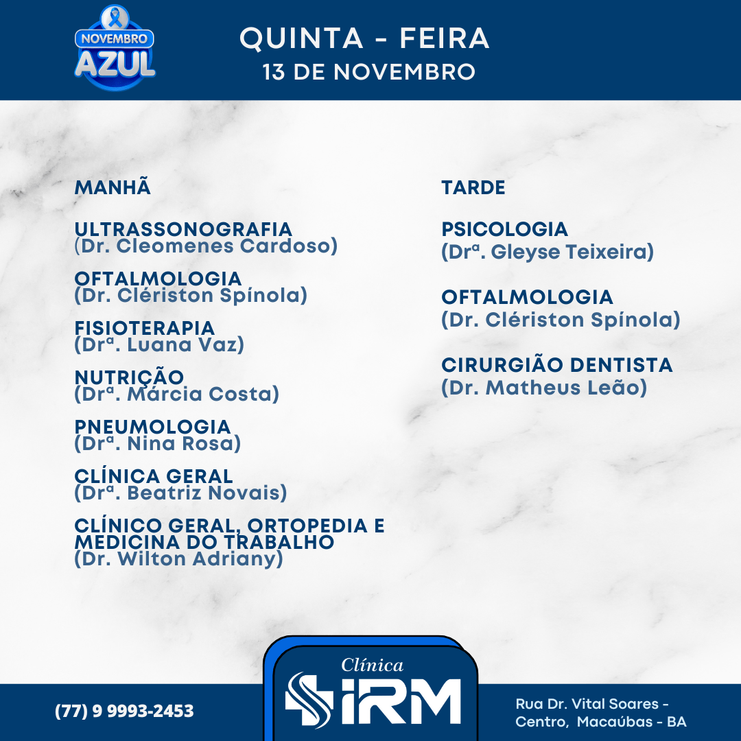 AGENDA SEMANAL DE ATENDIMENTO – MÊS DE NOVEMBRO NA CLÍNICA IRM – MACAÚBAS