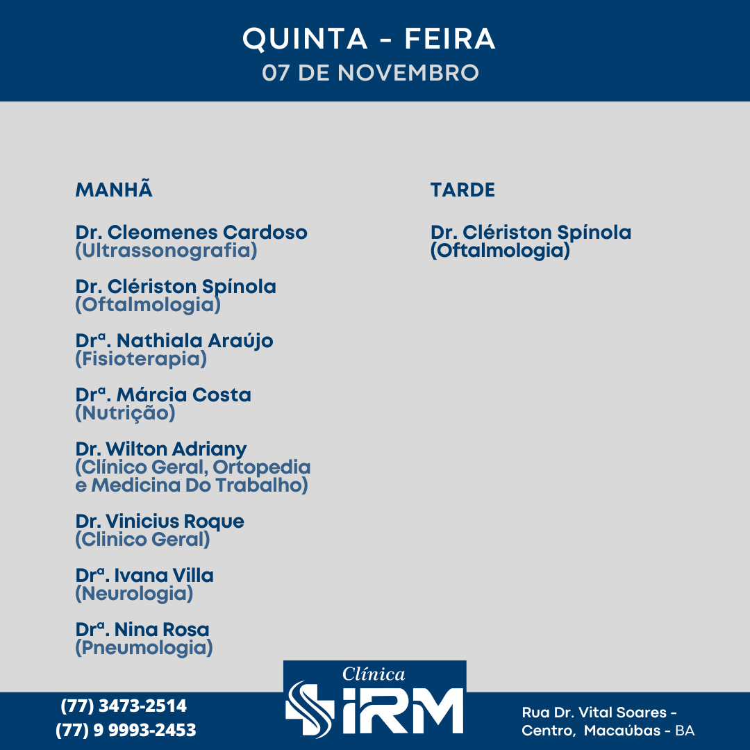 AGENDA SEMANAL DE ATENDIMENTO – MÊS DE NOVEMBRO NA CLÍNICA IRM – MACAÚBAS